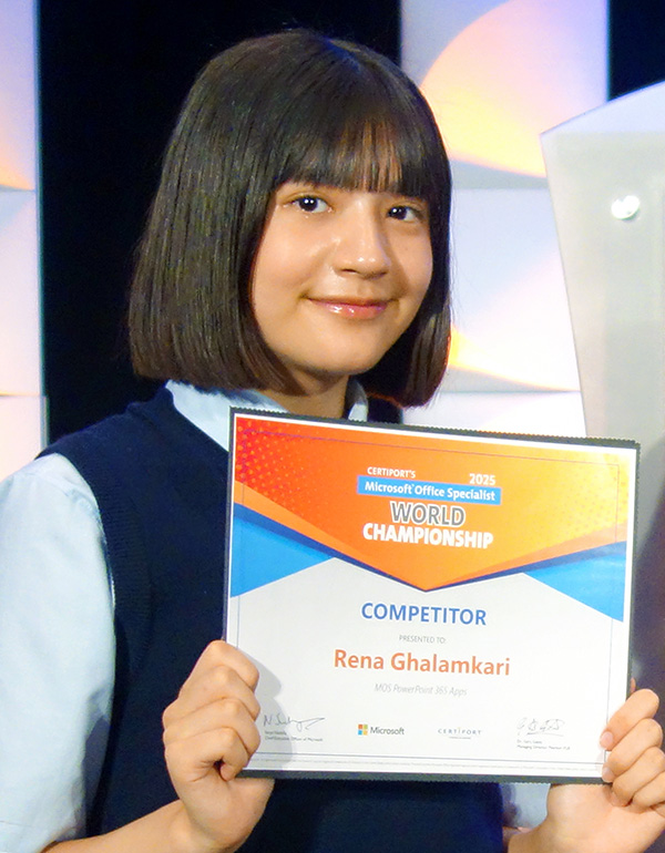 「MOS世界学生大会2025」は世界中の学生がエントリーし、決勝戦へと勝ち上がった38か国140名以上の各国代表と日本代表のガラムカリ玲奈さん(聖セシリア女子高等学校2年)は、PowerPointの決勝戦専用の試験に挑みました。