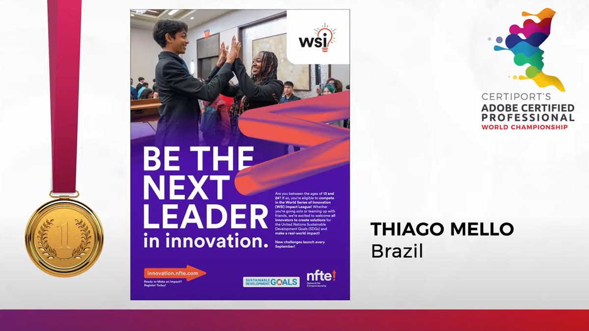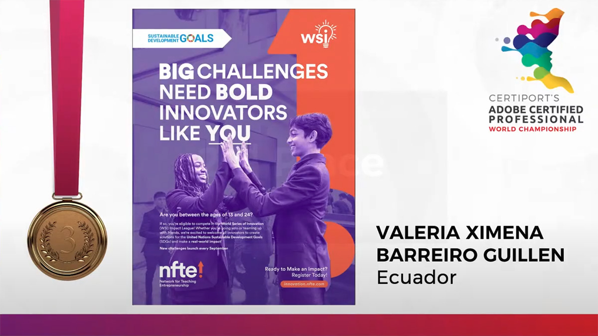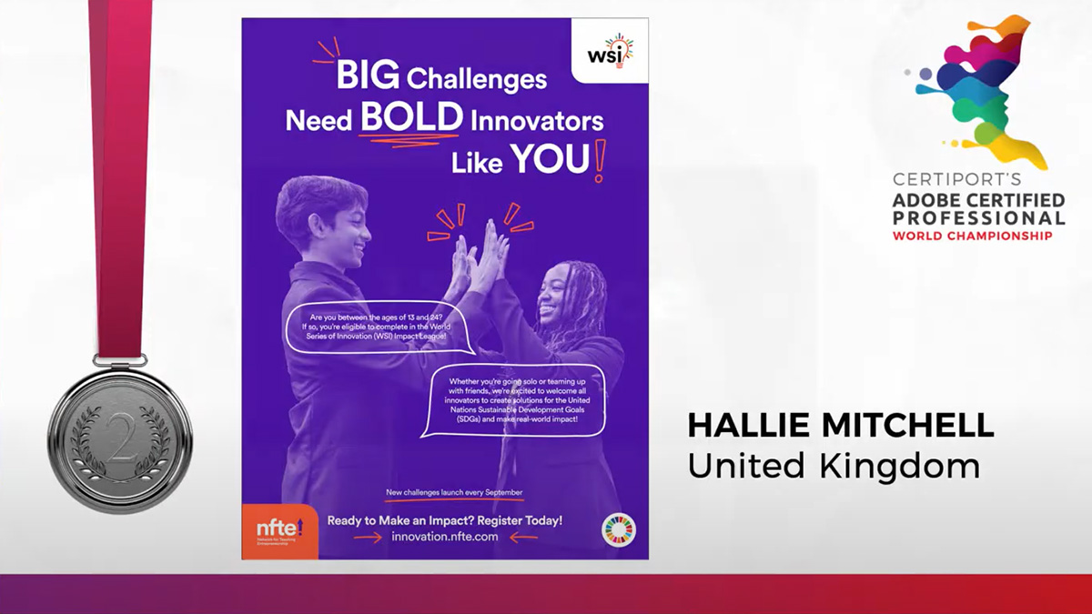 「アドビ認定プロフェッショナル世界学生大会2025」は、世界中の学生がエントリーし、決勝戦へと勝ち上った23か国47名の各国代表と日本代表の堀江志歩さん(大阪芸術大学3年)が、非営利団体のNetworking for Teaching Entrepreneurship(NFTE)のポスター・ソーシャルメディア投稿用画像という課題に取り組み、その技術とデザイン性、創造性を競いあいました。
