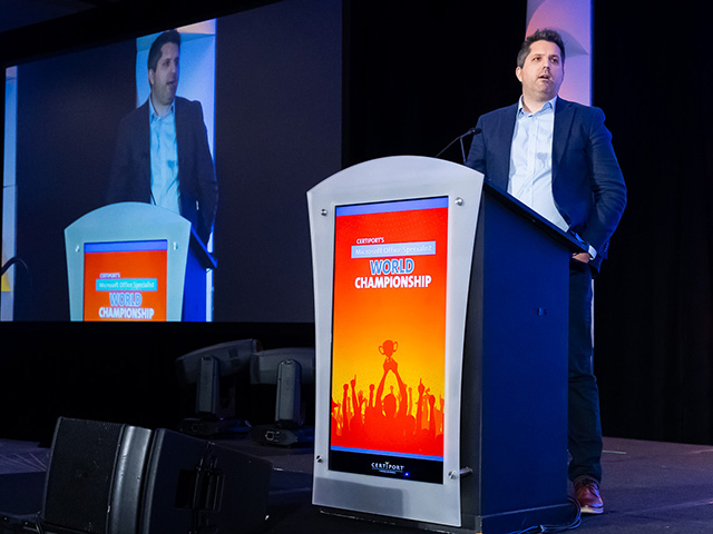 各国代表の登壇が終わると、決勝戦の結果発表は、Officeのバージョンおよびアプリケーションごとの部門別に、3位から1位のメダリストの順で進められます。