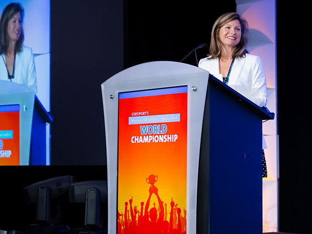 MOS決勝戦の試験では、実在の非営利団体のために資料を作成する課題が出されます。表彰式冒頭では、課題の提供元である非営利団体、そしてMicrosoftおよびPearsonの関係者から講評が述べられました。